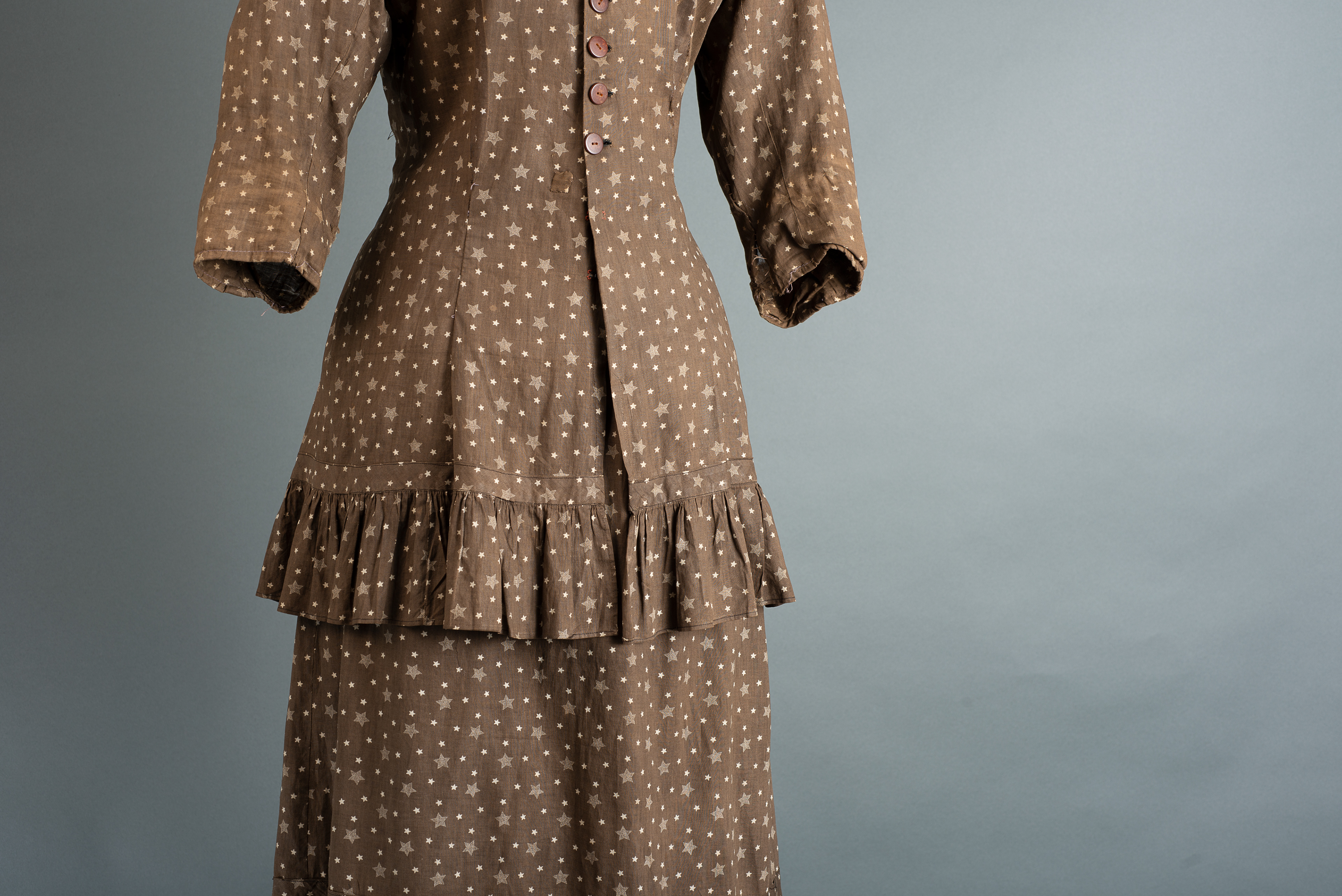 The motif on this dress consists of adorable white stars on a brown background. This cotton dress is a work dress, due to its loose fitting nature and ability to hide dirt and stains. It had very loose fitting sleeves that made it easy for the woman to move her arms. This dress is fitted with princess seams, which made the shape of the dress loose and comfortable. This dress does not have any boning which makes it less restrictive than many other styles. The bodice of this dress is also a basque bodice, due to its long loose fit. This dress was worn often the woman who owned it, Mrs. Billings, had patched it so she could continue wearing it even in its deteriorating condition.